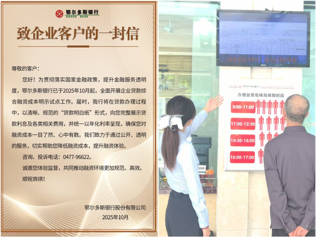 “以前办贷款时各项费用‘雾里看花’,申请贷款时总是心存顾虑,现在鄂尔多斯银行给我的这‘一封信’‘一张纸’,让我们签订贷款合同时心里更有底了”。鄂尔多斯市一家生物科技公司的财务负责人填制完“贷款明白纸”感慨道。鄂尔多斯银行专门编制了《致企业客户的一封信》,以通俗易懂的语言详细说明综合融资成本的构成、明示方式及其对企业的实际意义,帮助客户理解政策内涵,增强客户知情权与选择权,提升客户敢贷、愿贷积极性。