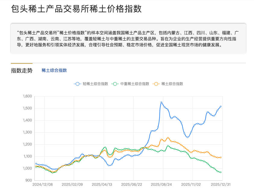 包头稀土产品交易所稀土价格指数由内蒙古科技大学具体编制,依托稀交所交易数据及面向全国稀土企业的价格采集信息,并参照市场消费情况,在国家发展和改革委员会价格监测中心、新华社中国经济信息社等单位指导下完成,覆盖镧、铈、镨、钕等稀土市场主流产品,全面、动态反映我国稀土产品整体价格走势和细分品种的行情变化,为稀土产业提供更及时、准确、透明的价格参考。