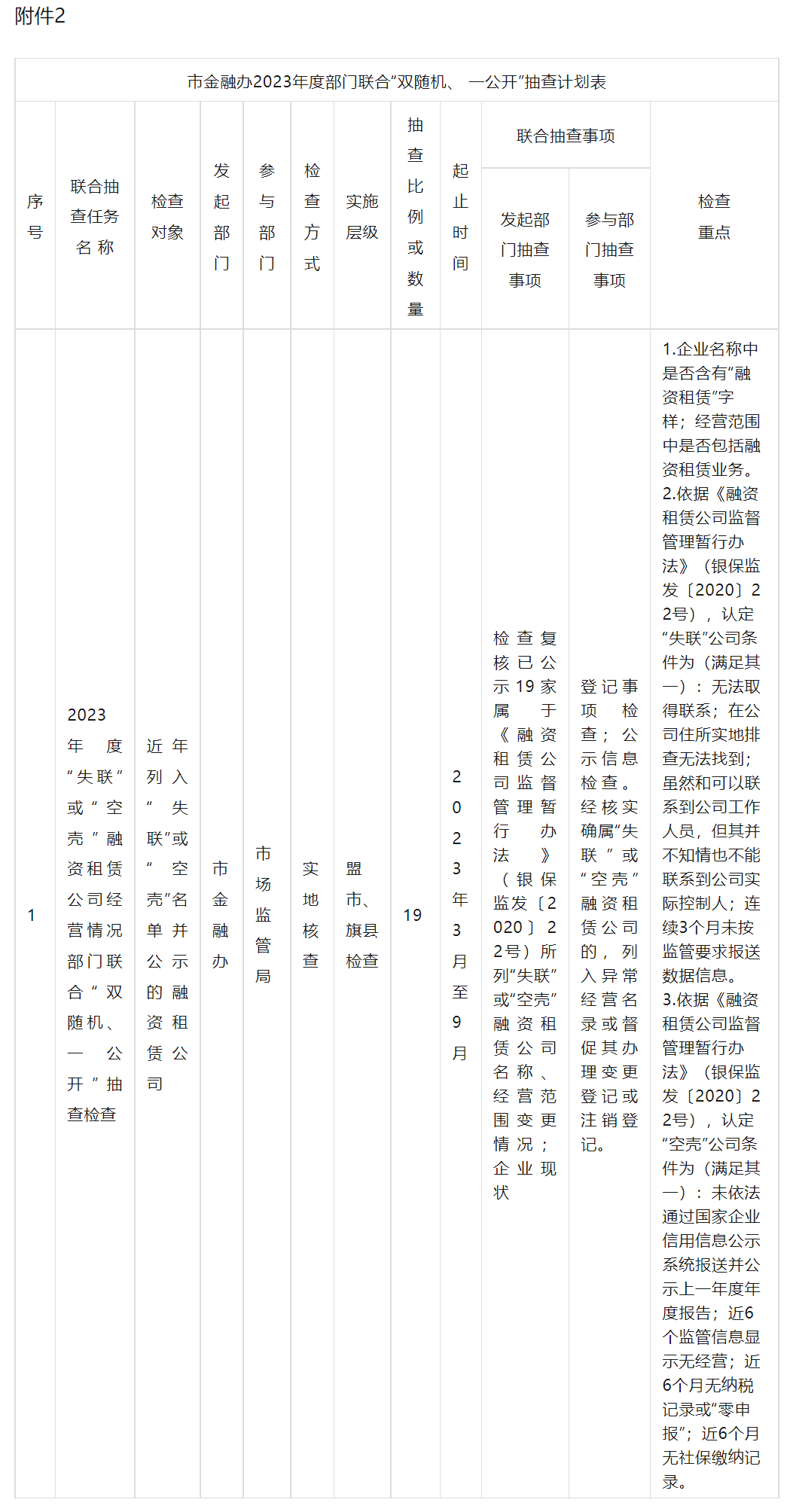 按照自治区地方金融监管局要求,结合《呼和浩特市市场监管领域2023年度部门联合“双随机、一公开”抽查计划表》中具体任务,压实属地监管职责,逐项开展跨部门联合检查(详见附件2)。